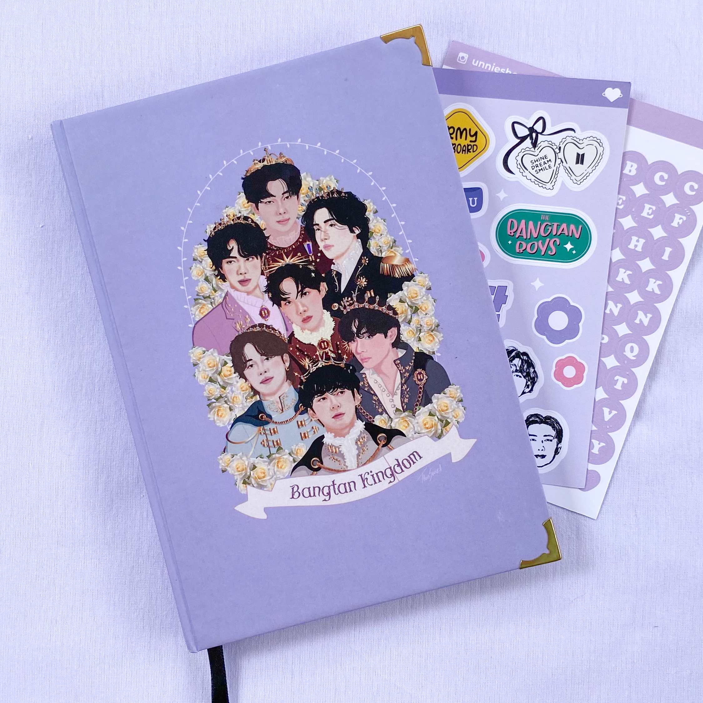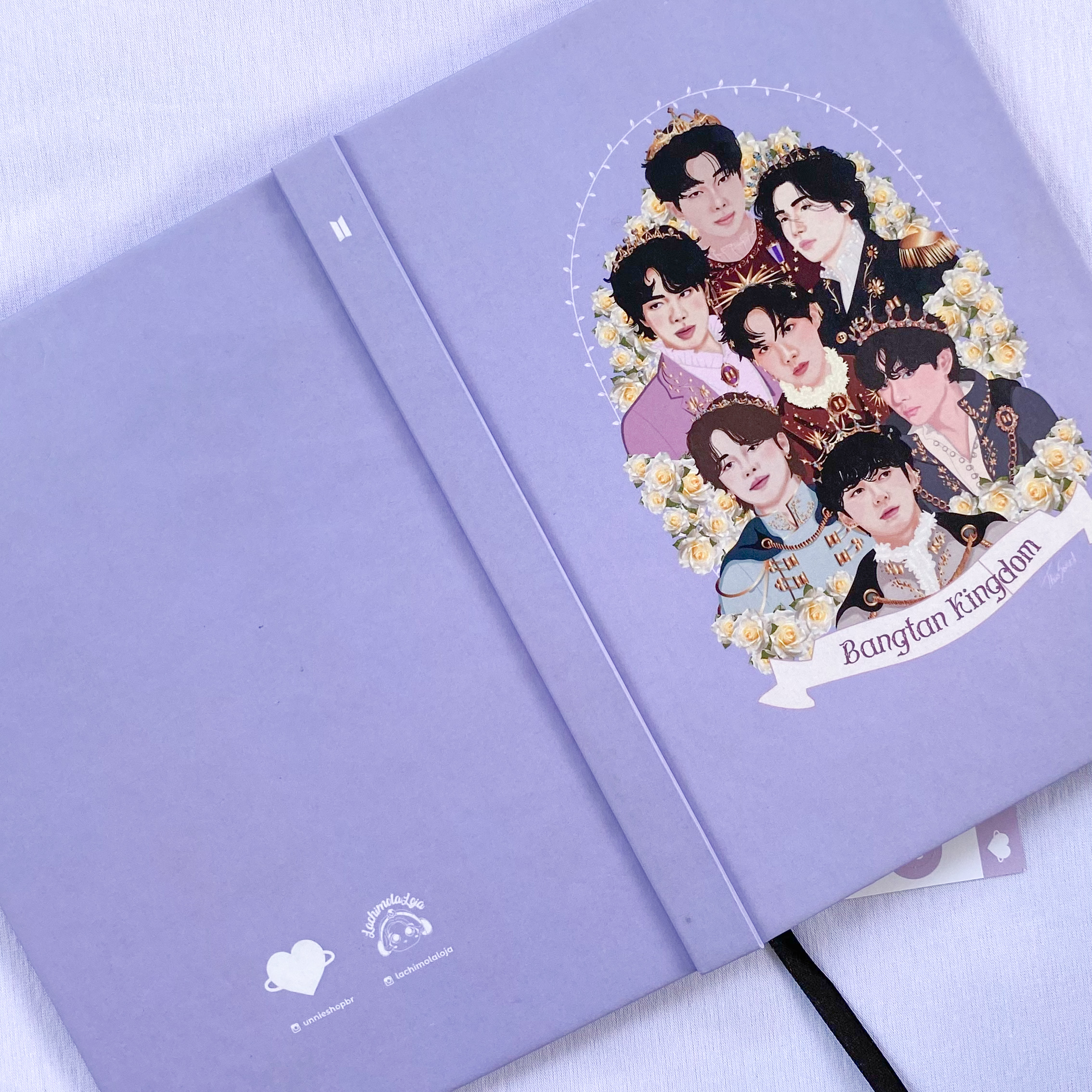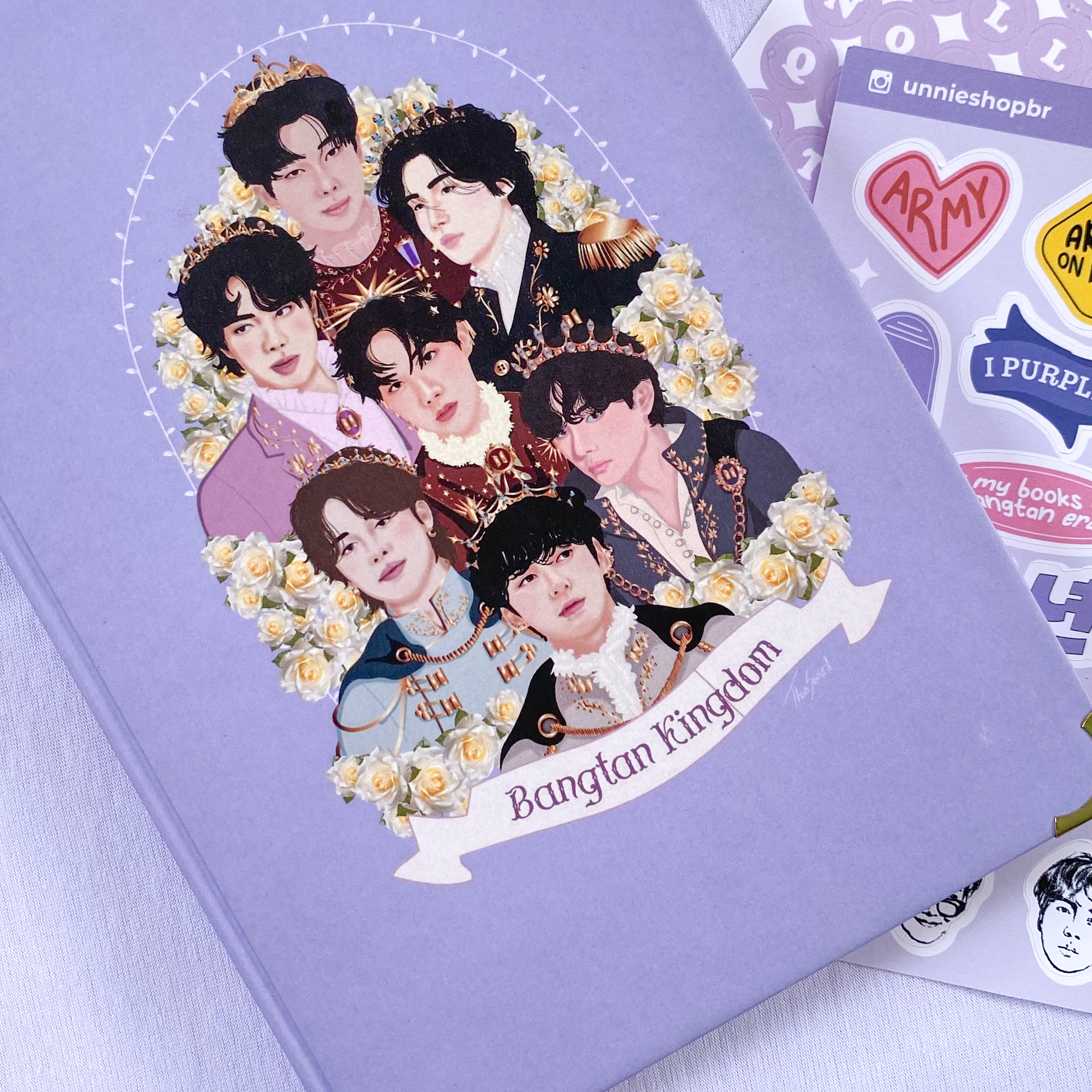 a caderneta bangtan kingdom é uma collab UNNIE & LACHIMOLALOJA, que com um design sofisticado, cheio de significado e único (ilustração exclusiva, feita pela @lachimolaloja) remete tudo que o BTS representa para o fandom.