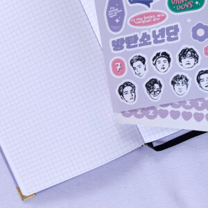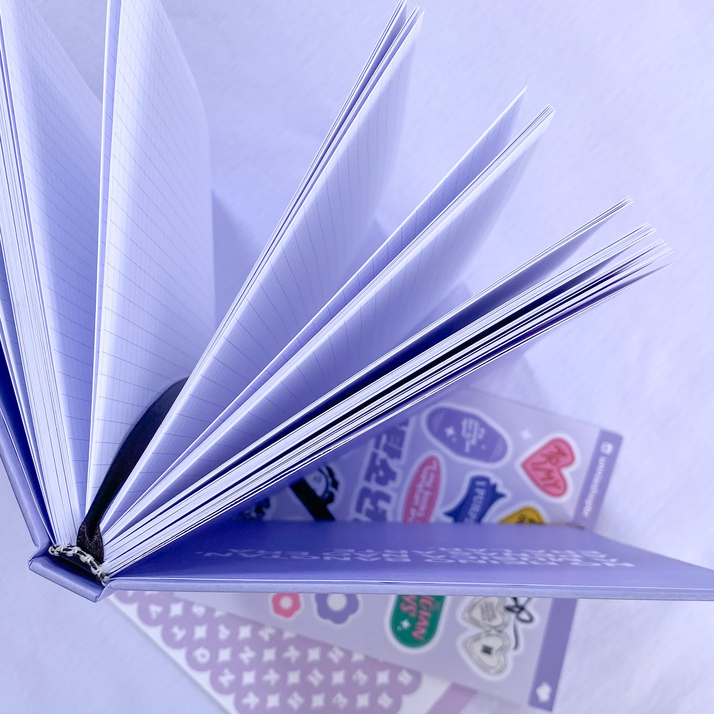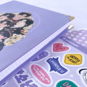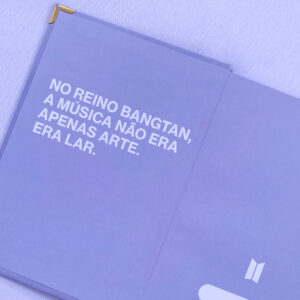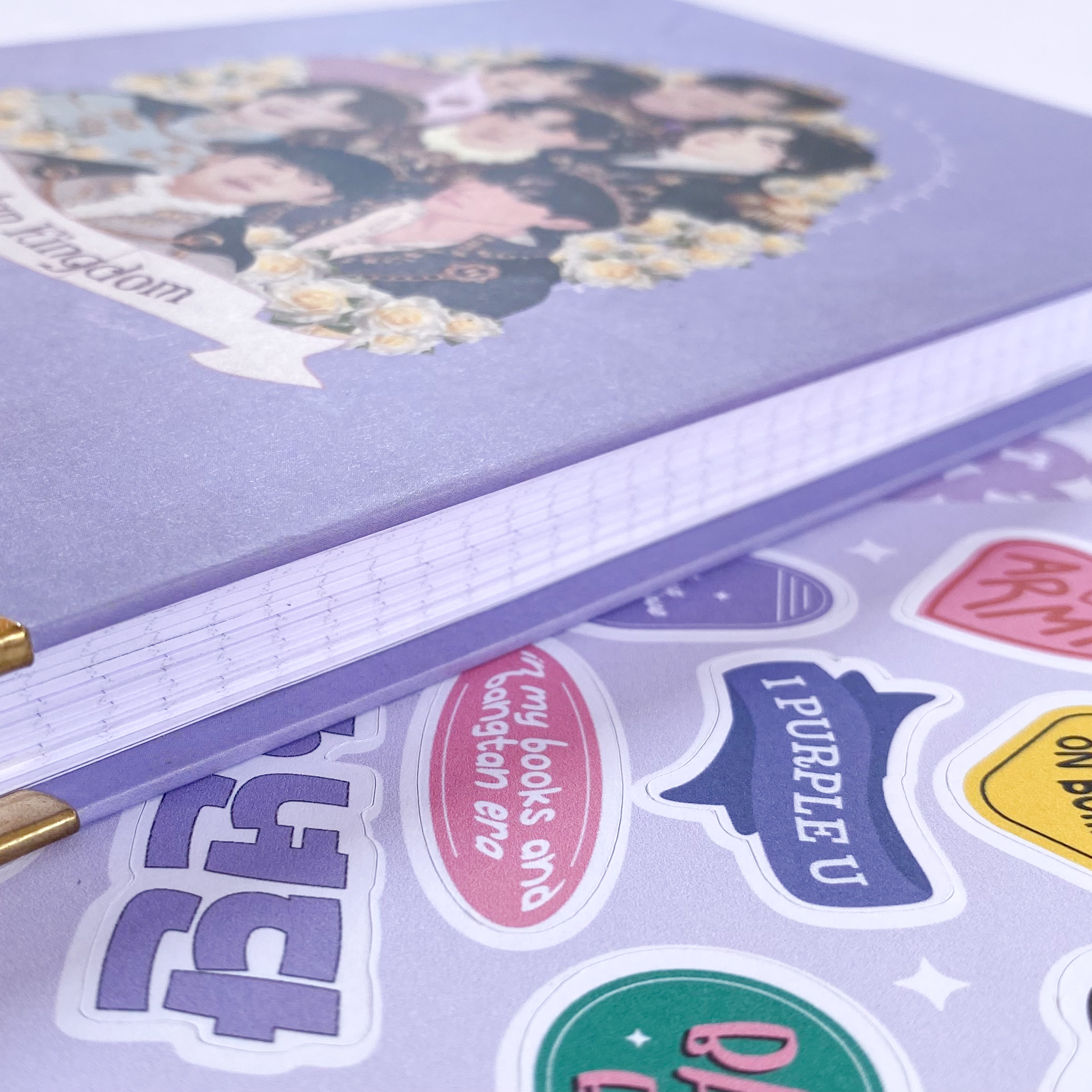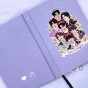 a caderneta bangtan kingdom é uma collab UNNIE & LACHIMOLALOJA, que com um design sofisticado, cheio de significado e único (ilustração exclusiva, feita pela @lachimolaloja) remete tudo que o BTS representa para o fandom.