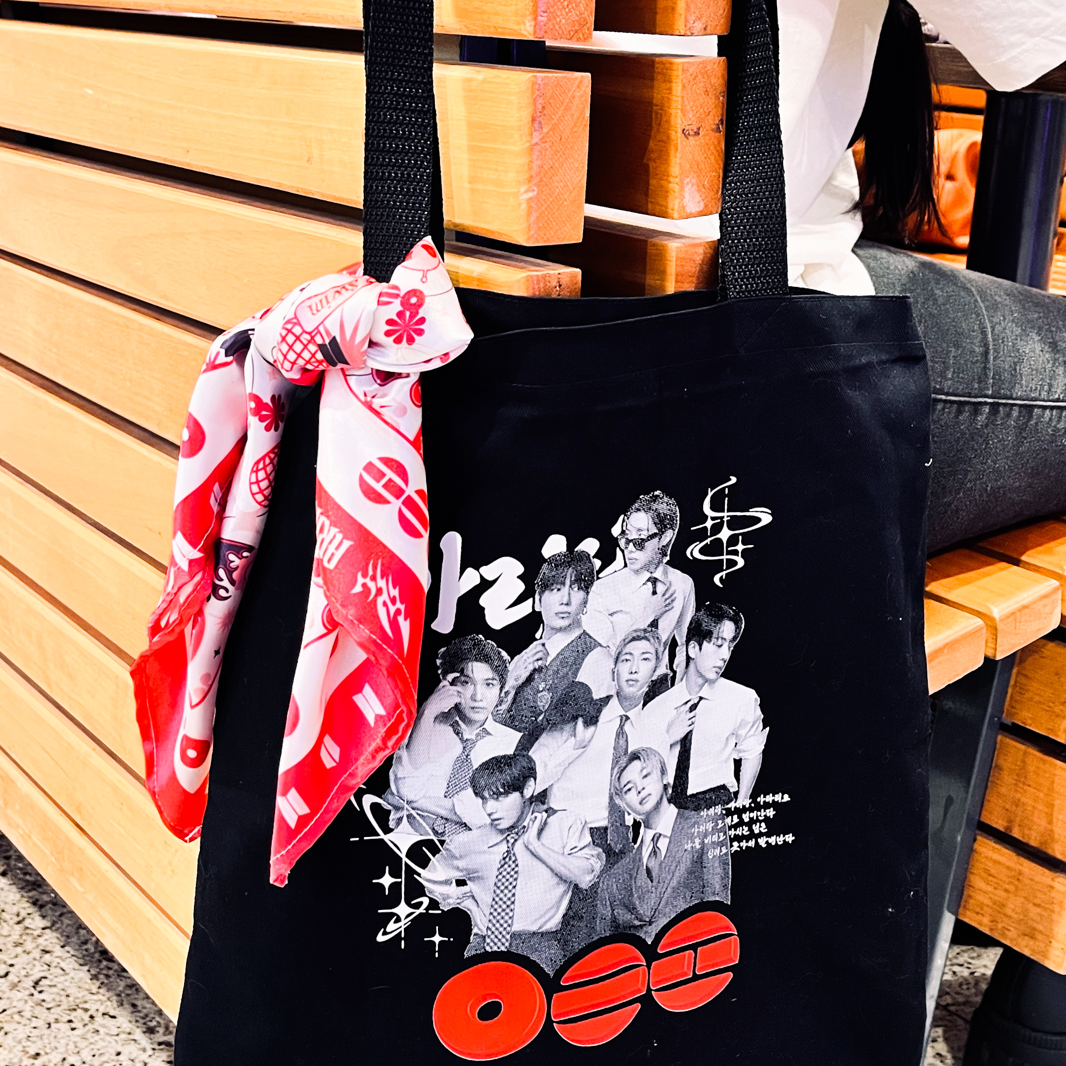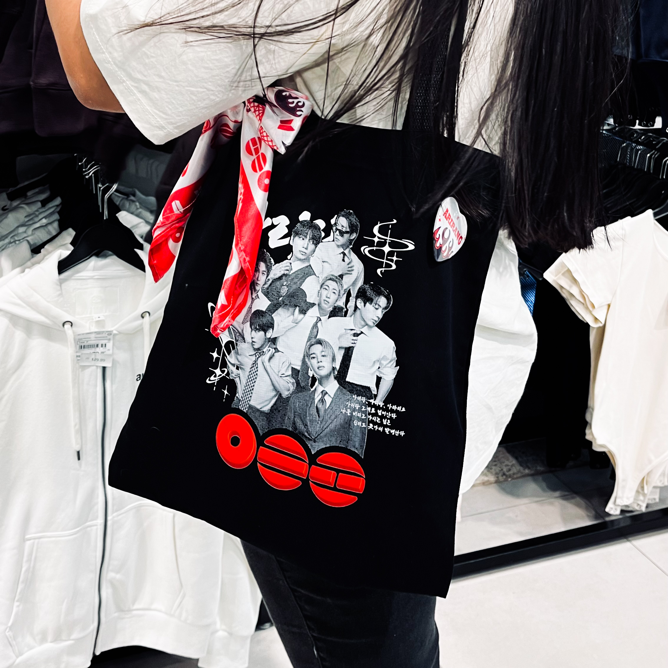 A ecobag preta do BTS traz a mesma estampa autoral exclusiva, inspirada no novo álbum ARIRANG, perfeita para fãs que querem levar sua paixão no dia a dia.