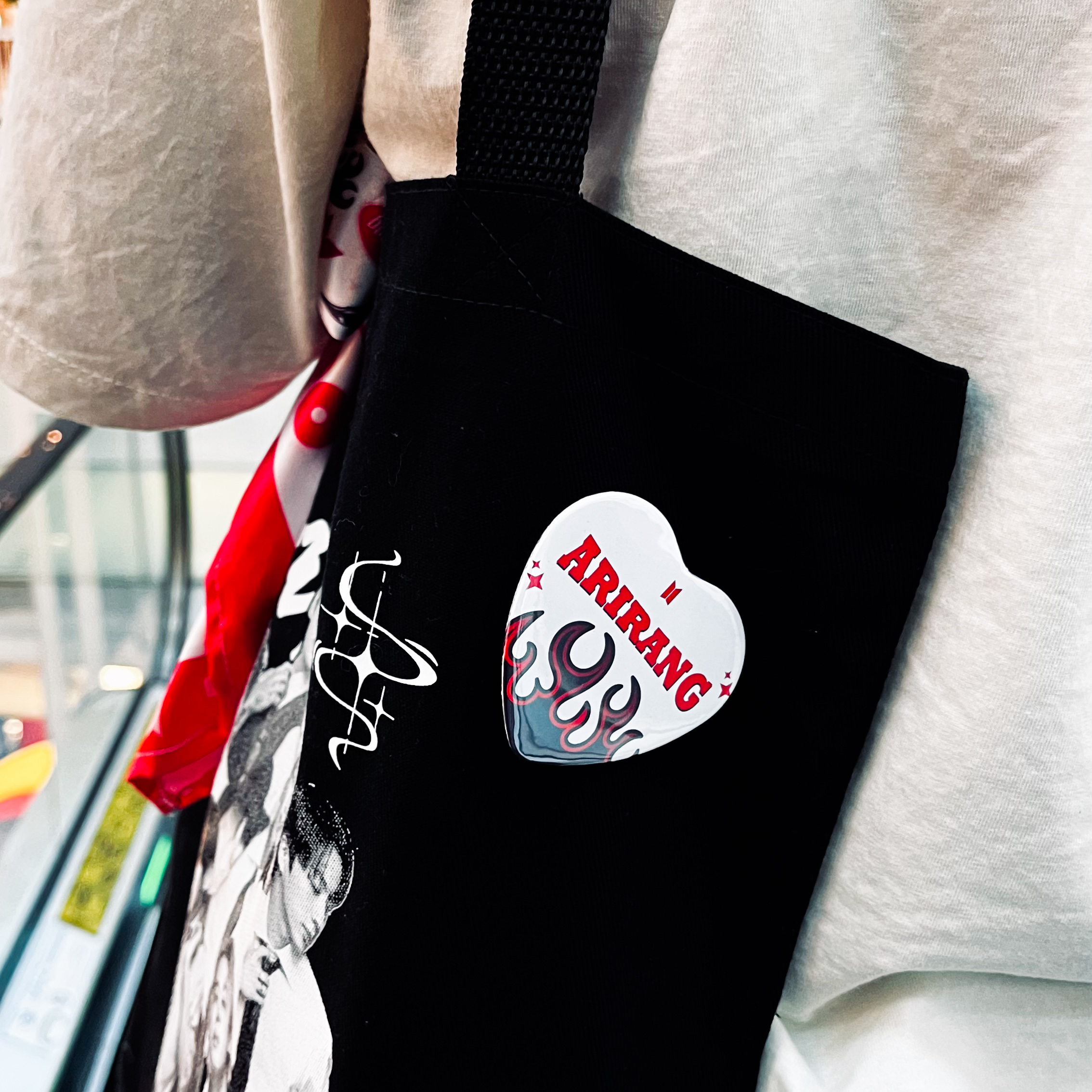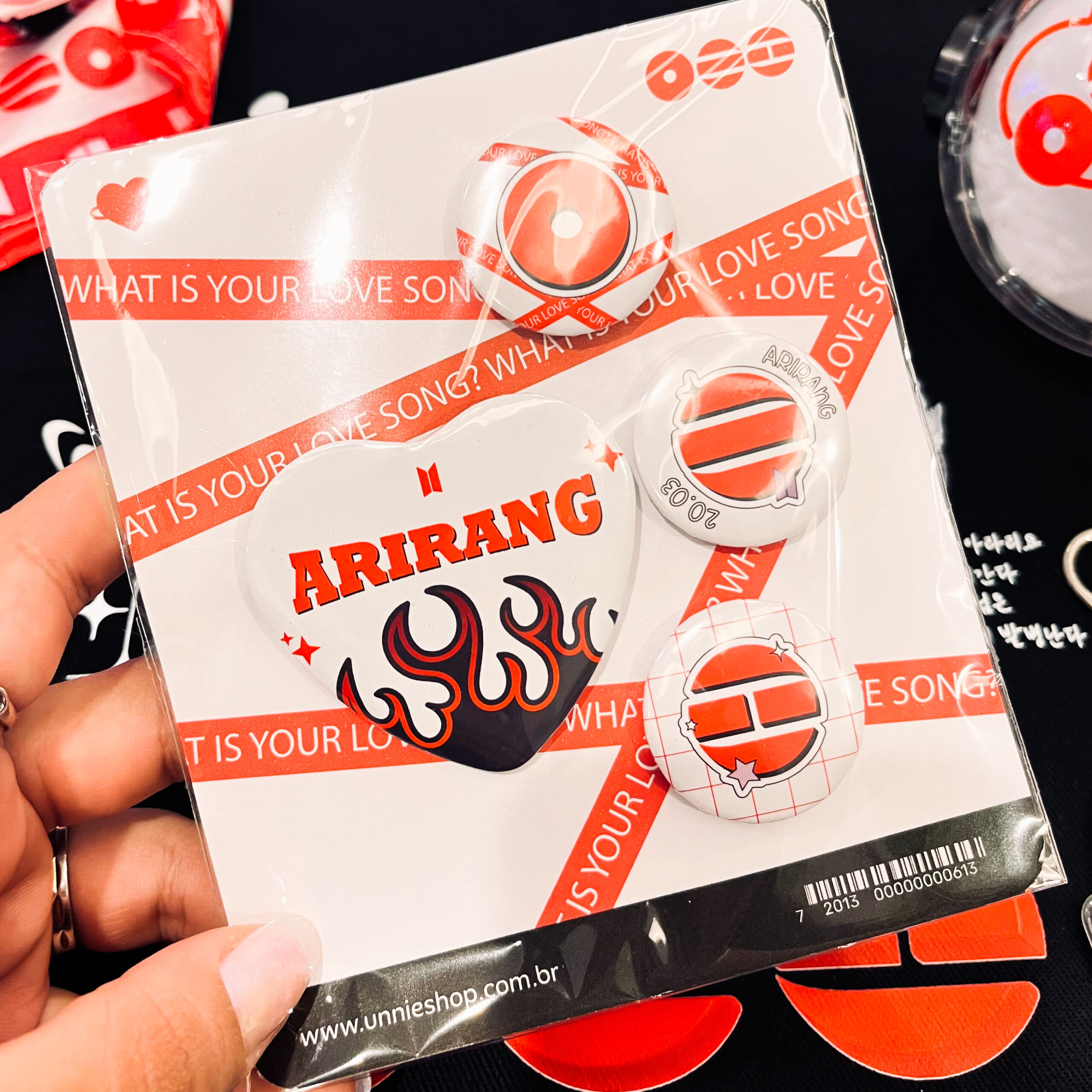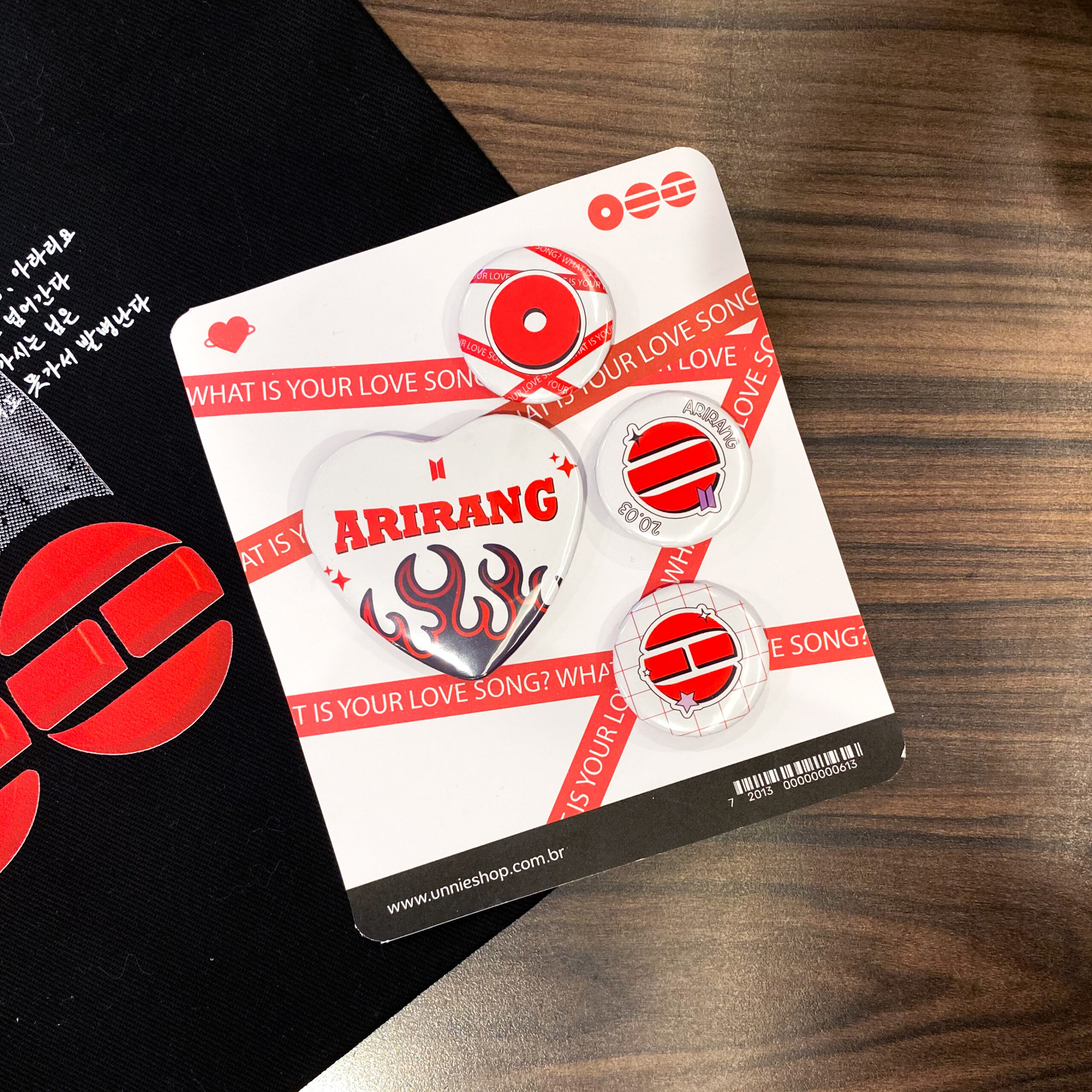 O kit é composto por 4 bottons, sendo 3 redondos e 1 em formato de coração, criando uma combinação equilibrada entre estilo e personalidade. As artes dialogam entre si, explorando a estética do álbum de forma criativa e simbólica.